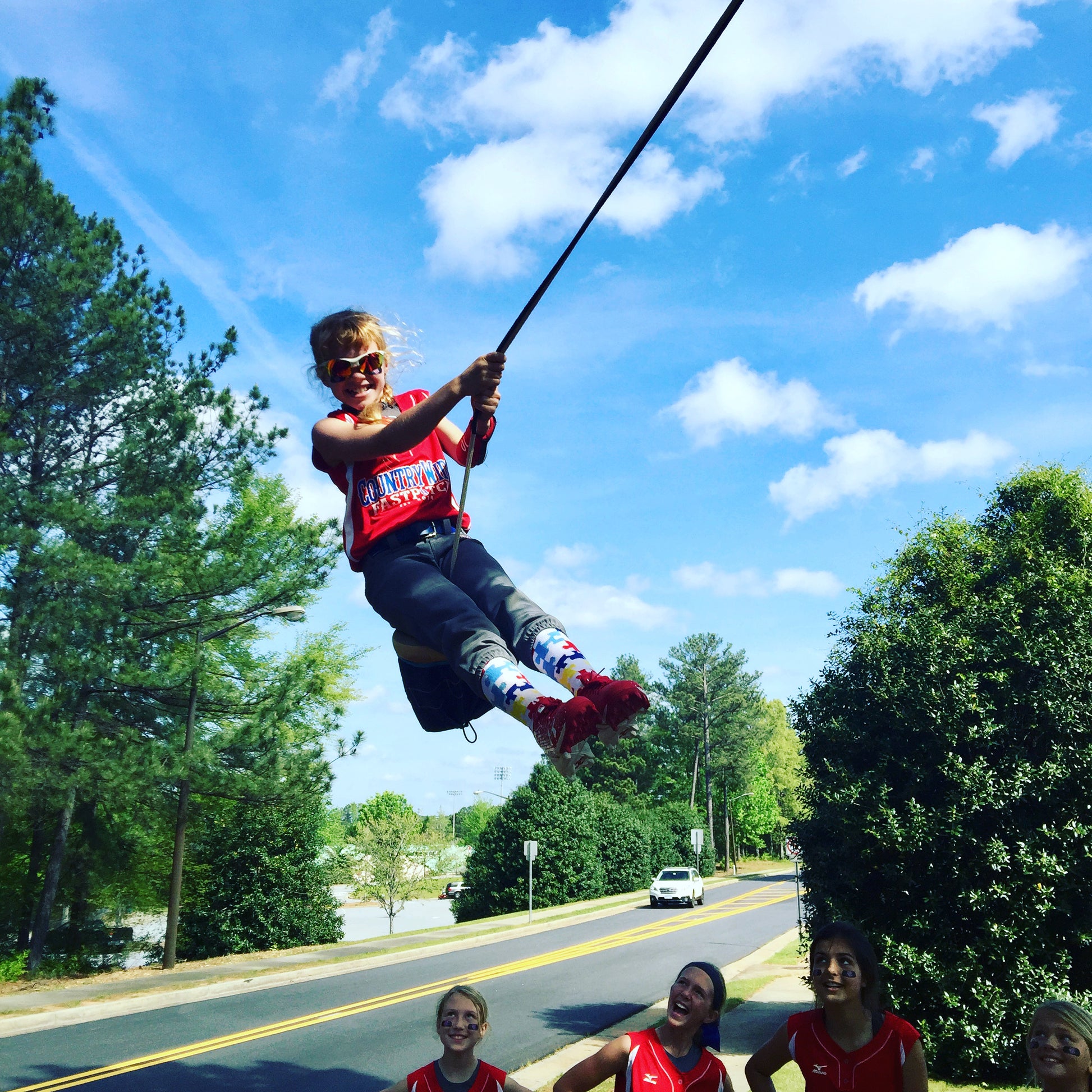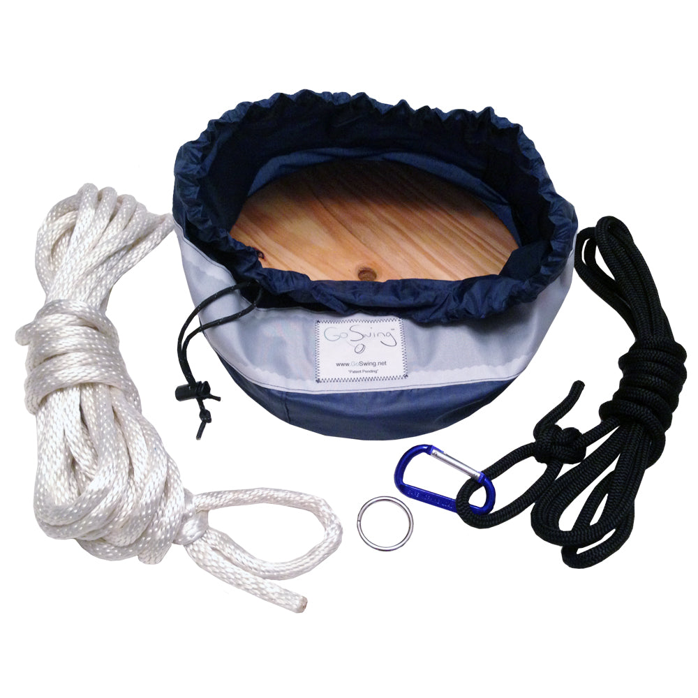 Includes wooden disc with bag attached, 25 Ft Main Rope, 12 Ft Retrieval Rope, Carabiner, Metal Ring, Written Instructions